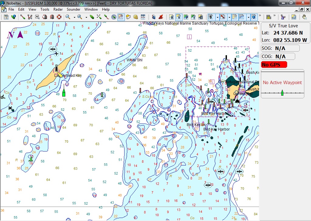Shown below are three examples. The first example shows screen shots from Nobeltec as the user toggled among his original Passport Vector Chart, a ChartAid Photo Chart that he generated, and the Vector and Photo Overlay for the Dry Tortugas National Park area in Florida Keys.